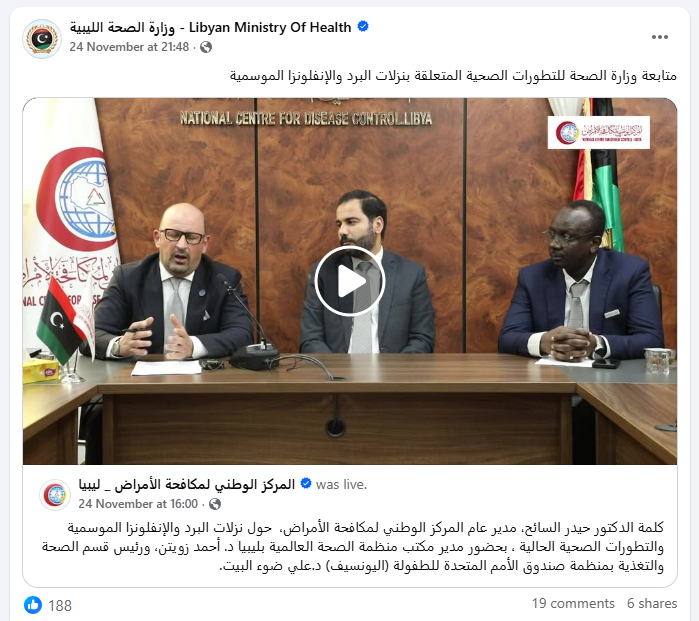 قادنا البحث بالكلمات المفتاحية إلى تصريحات رسمية صادرة عن المركز الوطني لمكافحة الأمراض في ليبيا، والتي تتعارض بشكل مباشر مع طبيعة هذه الادعاءات حيث أعلن المركز الوطني لمكافحة الأمراض عن مؤتمر صحفي للدكتور حيدر السائح، مدير عام المركز، حول نزلات البرد والإنفلونزا الموسمية والتطورات الصحية الحالية، وفي هذا السياق، أكد الدكتور حيدر السائح أن الوضع الصحي في ليبيا مطمئن جدًا مشدداً على أن الفيروسات المنتشرة حاليًا طبيعية وتظهر سنويًا مع دخول فصل الشتاء وأوضح أن التحاليل المخبرية بيّنت انتشار فيروس الإنفلونزا الموسمية من النوع A إلى جانب تسجيل إصابات بفيروس التنفس المخلوي، وهما من الفيروسات المعتادة خلال هذه الفترة من العام وهذا التأكيد الرسمي ينفي بشكل قاطع وجود "فايروس جديد" يتطلب إجراءات إغلاق طارئة.
