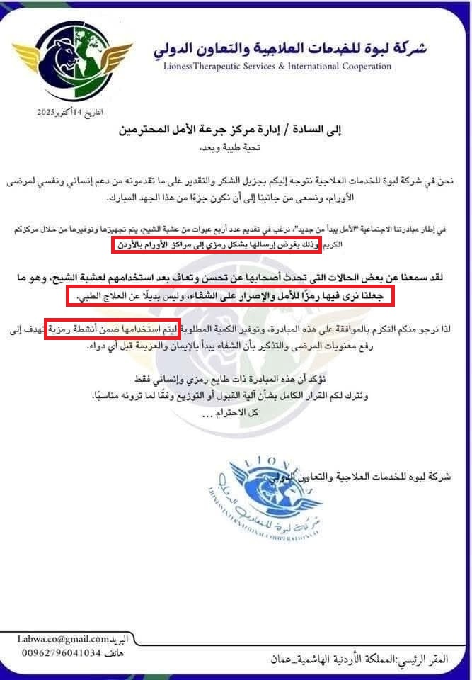 وبالتدقيق في نص المخاطبة من قبل شركة لبوة للتعاون الدولي لمركز جرعة أمل نلاحظ أشارة الشركة إلى أنها تود الحصول على كمية من "الشيح" لاستخدامها في أنشطة رمزية لرفع معنويات المرضى، وليس كبديل علاجي أو دليل على الشفاء من السرطان.