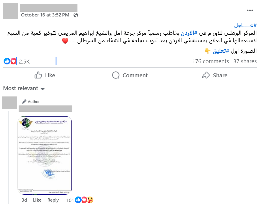 وعليه، فإن الادعاء مضلل، حيث أن المراسلة ليست من المركز الوطني للأورام في الأردن، بل من شركة ليبية خاصة، كما أن الغرض المعلن للحصول على الشيح من هذه الشركة هو أنشطة رمزية لرفع معنويات المرضى وليس علاجًا بديلاً للشفاء من السرطان.