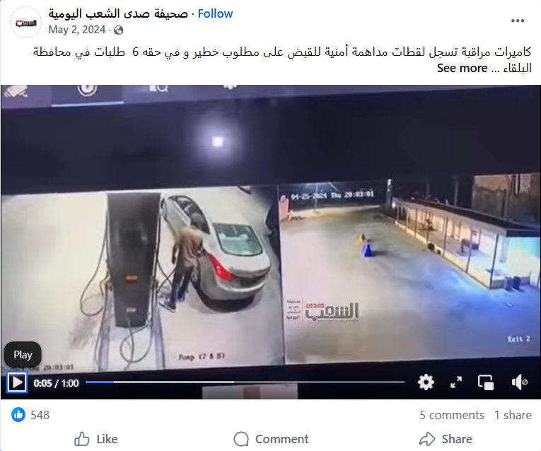 اتضح أن الادعاء مضلل، حيث قادنا البحث العكسي عن لقطة ثابتة من مقطع الادعاء إلى فيديو مطابق نشر بتاريخ 2 مايو 2024 على صفحة صحيفة صدى الشعب بفيسبوك والتي أفادت أن كاميرات مراقبة تظهر مداهمة أمنية في محافظة البلقاء لمطلوب خطير بالأردن.
