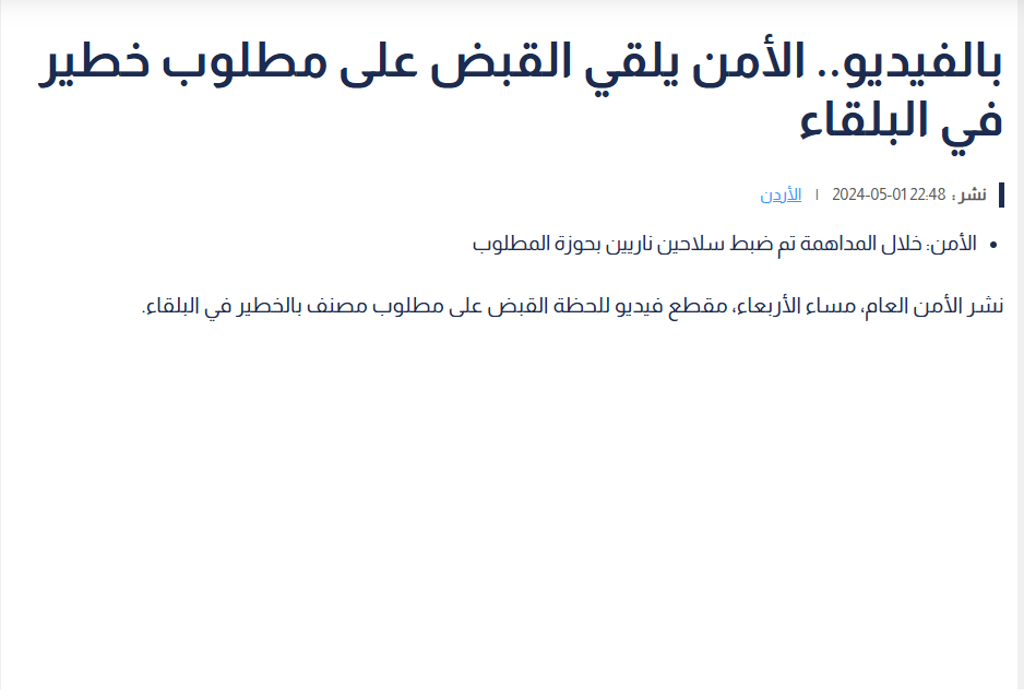 كما قادنا البحث بالكلمات المفتاحية إلى منشور لقناة رؤيا الإخباري الأردنية نشرت فيه الفيديو وأفادت في تقرير أن المقطع يوثق مداهمة للبحث الجنائي الأردني لمطلوبين في إحدى مناطق غرب البلقاء بتاريخ 25 إبريل 2024