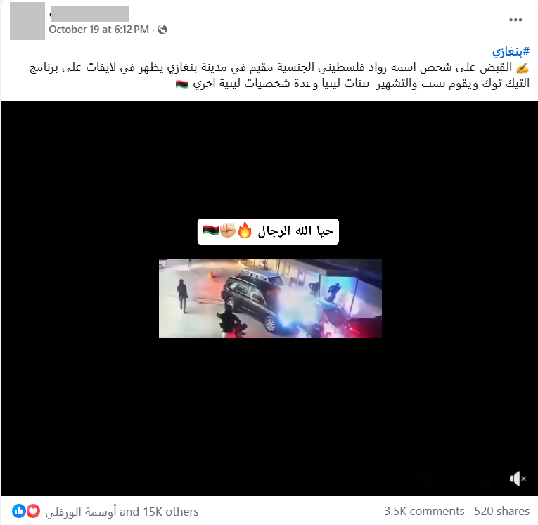 قمنا برصد ادعاء لأول مرة من إحدى الحسابات على منصة فيسبوك والذي نٌشر في 19 أكتوبر 2025 على تمام الساعة 18:12مساءً بتوقيت ليبيا وكان نص الادعاء كالاتي: "#بنغازي ✍️ القبض على شخص اسمه رواد فلسطيني الجنسية مقيم في مدينة بنغازي يظهر في لايفات على برنامج التيك توك ويقوم بسب والتشهير ببنات ليبيا وعدة شخصيات ليبية اخري 🇱🇾"