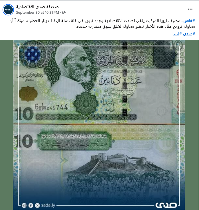 قادنا البحث إلى تصريح لصحيفة صدى الاقتصادية والتي تتفرد بتصريحات خاصة لمسؤولين من مصرف ليبيا المركزي بتاريخ 30 سبتمبر 2025، الذي أفادت فيه بأن مصرف ليبيا المركزي نفى بشكل قاطع وجود أي تزوير في فئة عملة الـ 10 دينار الخضراء.