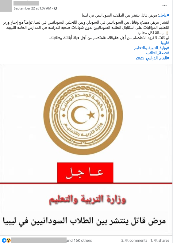 وعليه فإن الادعاء مضلل، ولم تسجل أي تفشيات وبائية بين الطلاب أو اللاجئين السودانيين في ليبيا حتى تاريخ نشر هذا التحقق.