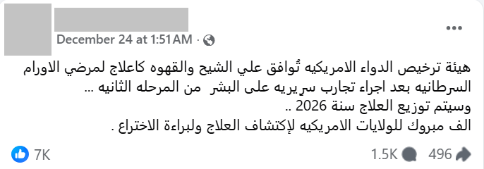 بناءً على ما سبق، فإن هذا الادعاء زائف تماماً؛ إذ لم تصدر هيئة الغذاء والدواء (FDA) أو أي جهة دولية أو محلية موافقة على هذا المزيج كعلاج للسرطان حتى تاريخه. وما يزال المسار العلمي المعتمد يؤكد أن ادعاء اعتماد أي علاج وهو لا يزال في المرحلة الثانية (Phase 2) هو ادعاء باطل علمياً وقانونياً؛ كونها مرحلة تجريبية تقتصر على تقييم الفعالية والآثار الجانبية، ولا تمنح أي حق في الاعتماد النهائي أو التوزيع التجاري.