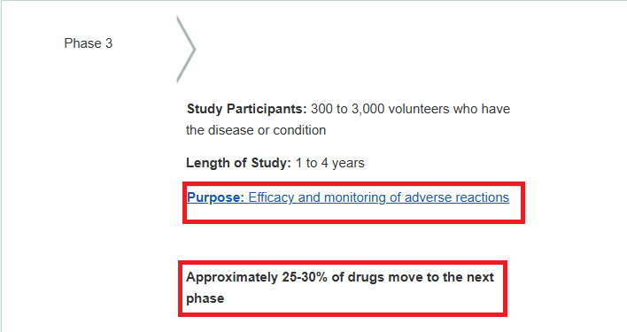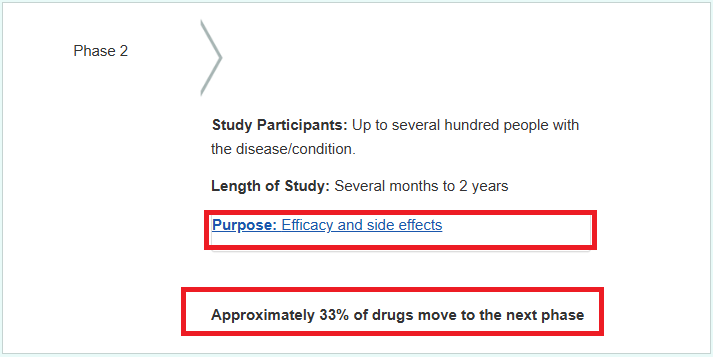 لقطة شاشة توضح أن المرحلة الثانية مجرد خطوة تجريبية لقياس الفعالية والآثار الجانبية على عدد محدود، ولا تعني اعتماد الدواء؛ حيث تفشل 67% من الأدوية في تجاوزها والوصول للمرحلة التالية وفقاً لإحصائيات الـ FDA