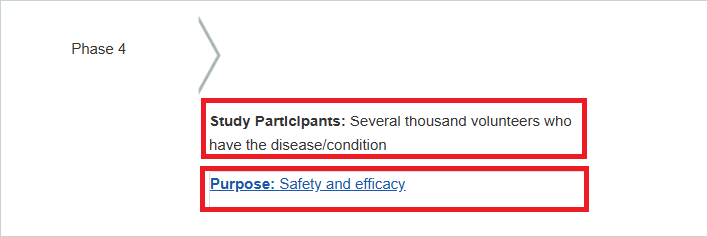أما المرحلة الرابعة (Phase 4) فهي تجرى على آلاف المتطوعين المصابين بالمرض وهدفها الرئيسي هو التحقق من الأمان والفعالية على المدى الطويل ورصد أي آثار جانبية تظهر بعد الاستخدام الواسع للدواء: