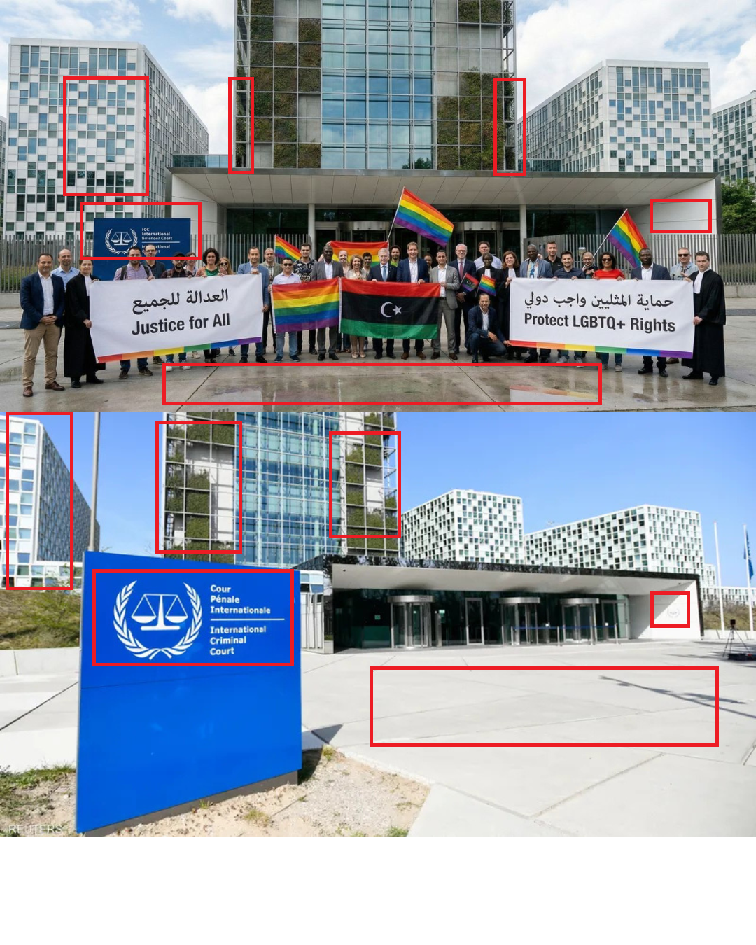 وبالتوازي مع ذلك، كشفت المقارنة مع الهوية البصرية الرسمية للمحكمة وجود أخطاء في اللافتة الزرقاء التي ظهرت في صورة الادعاء بترتيب كلمات خاطئ يبدأ بعبارة (ICC International Court)، في حين أن اللافتة الحقيقية الموثقة في حسابات المحكمة تبدأ بعبارة (Cour pénale internationale) متبوعة بـ (International Criminal Court)، علاوة على اختلاف نوعية الأرضية التي ظهرت لامعة ورخامية بعكس الأرضية "المطفية" الحقيقية، واختفاء شعار المحكمة من الحائط الأيمن للمدخل، مع تباين واضح في عدد وترتيب نوافذ المباني المحيطة: