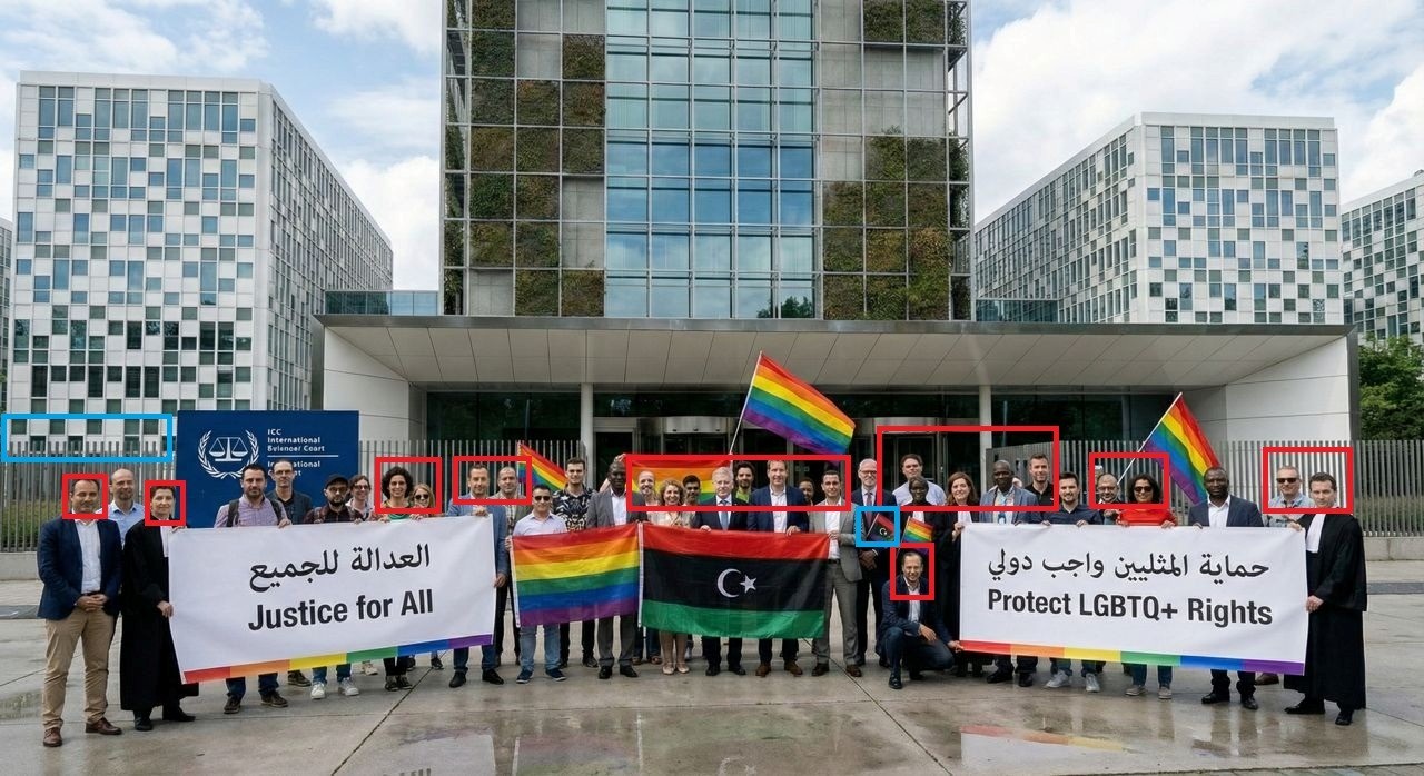 اتضح أن الادعاء زائف، حيث كشف التحليل البصري للصورة المرفقة أنها مزيفة ومولدة بواسطة الذكاء الاصطناعي وليست صورة حقيقية إذ تظهر الحشود بوجوه غير حقيقية تفتقر للملامح البشرية الطبيعية ولا تمثل أي شخصيات ليبية رسمية معروفة كما تبدو قضبان السياج في الخلفية مولدة بشكل غير طبيعي وغير متصلة بمدخل المحكمة، بالإضافة إلى وجود تداخل مشوه بين علم ليبيا وعلم "المثلية" مما غير الألوان الأصلية للعلم الليبي بشكل يشير بوضوح إلى تشوهات مولدات الذكاء الاصطناعي: