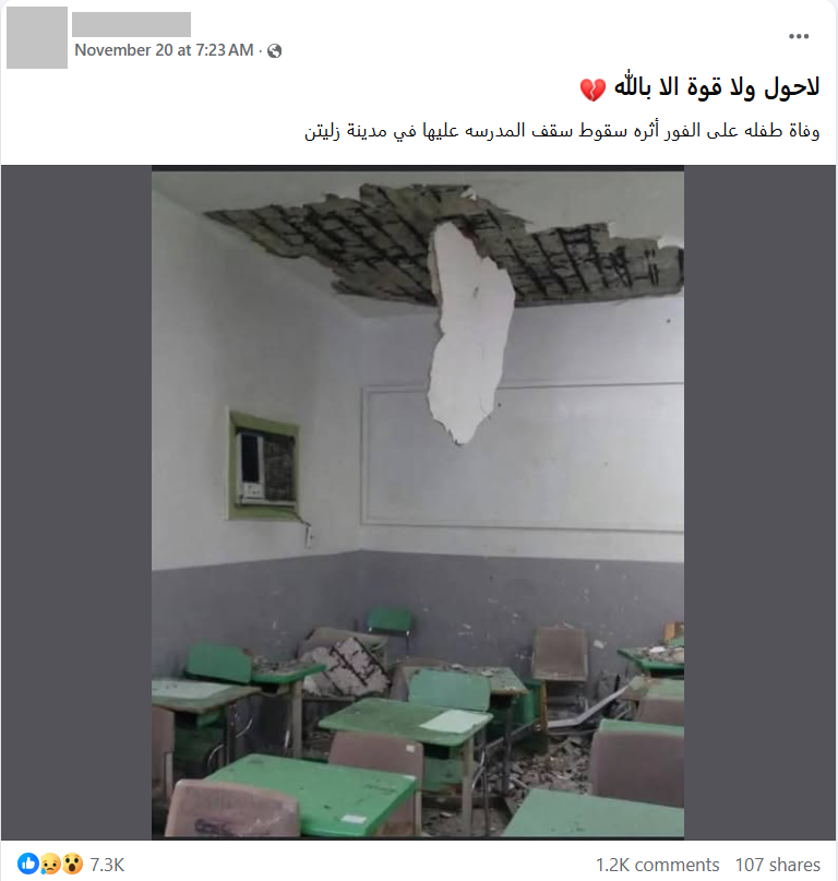 قادنا استخدام البحث العكسي عن الصورة المتداولة إلى اكتشاف أن الصورة حقيقةً تعود لحادثة انهيار جزء من سقف أحد الفصول في مدرسة الإمام النسائي المتوسطة بمدينة جدة، بالمملكة العربية السعودية حيث أن الصورة نُشرت عبر حساب إدارة تعليم جدة على منصة X بتاريخ 13 سبتمبر 2017، مؤكدة بذلك أن الادعاء لا يمت لليبيا بصلة.