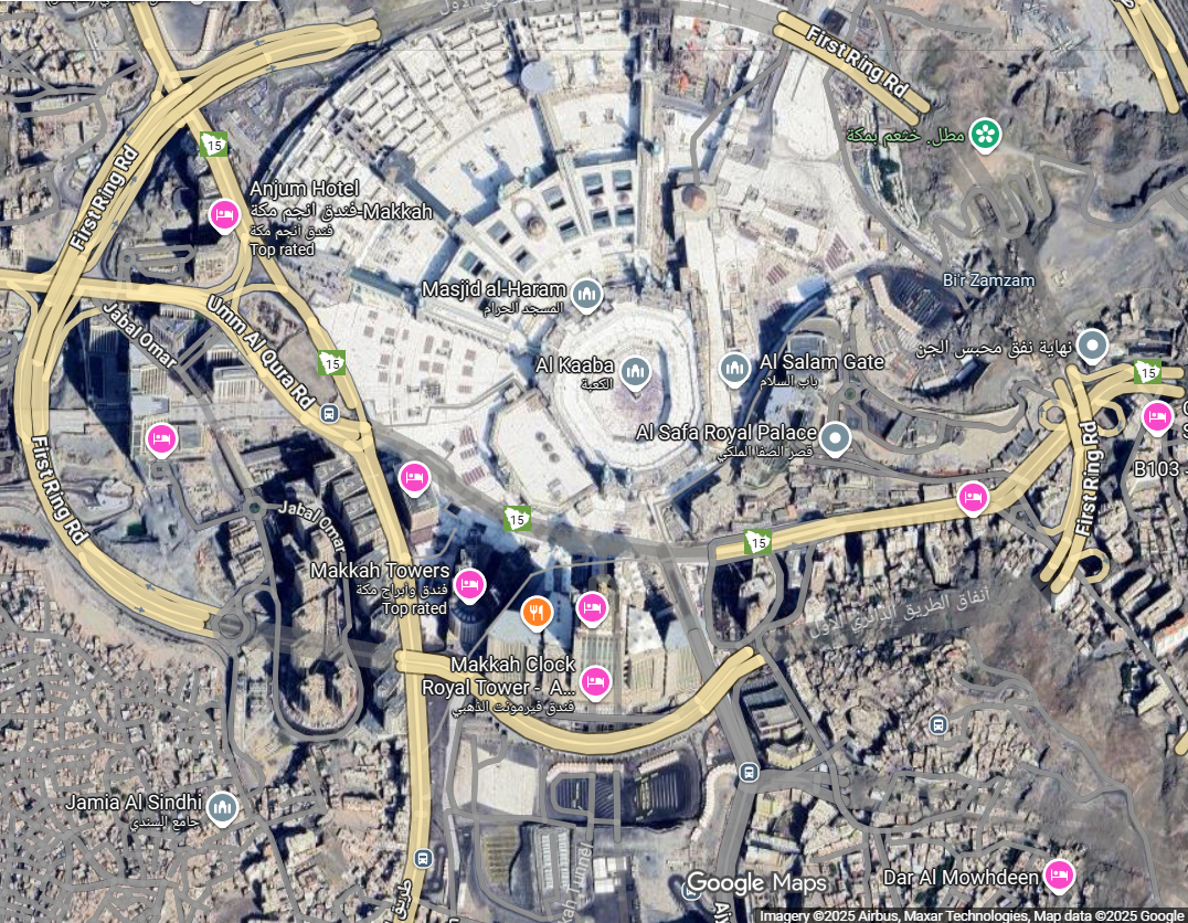 صورة الأقمار الصناعية على قوقل مابز تظهر الكعبة وبرج الساعة
