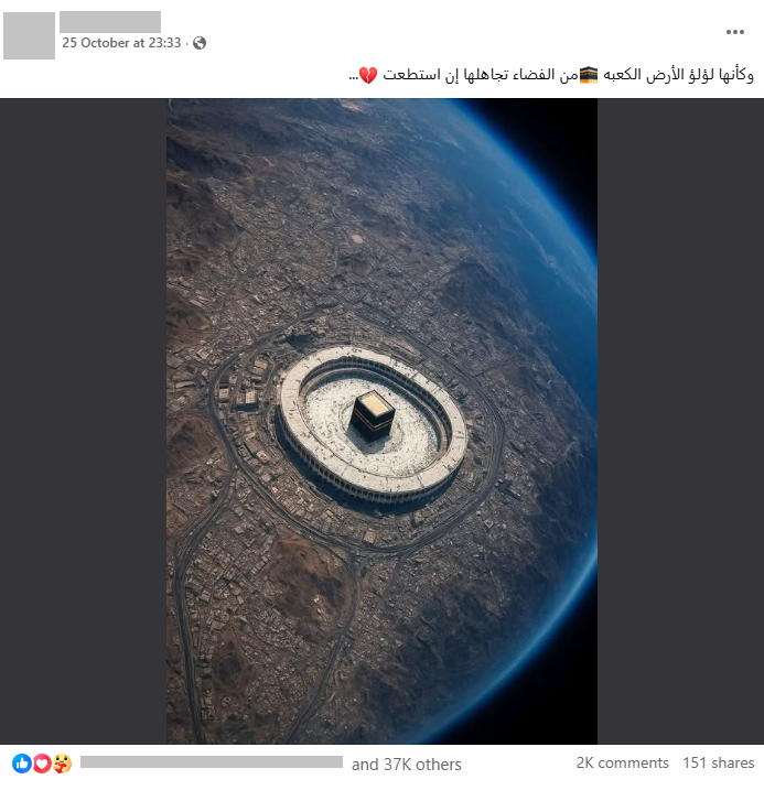 قمنا برصد ادعاء لأول مرة من هذه الصفحة على منصة فيسبوك، والذي نٌشر في 25 أكتوبر 2025 على تمام الساعة 23:33 مساءً بتوقيت ليبيا وكان نص الادعاء كالاتي: "وكأنها لؤلؤ الأرض الكعبة 🕋من الفضاء تجاهلها إن استطعت 💔..."