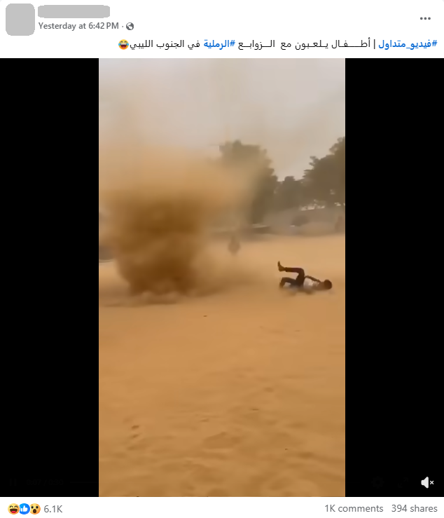 زائف2026/04/16 ذكاء اصطناعي محمد الطبالزائف: الفيديو مولد بالذكاء الإصطناعي وليس لأطفال من الجنوب الليبي يلعبون وسط زوبعة رمليةانتشر فيديو على منصة التواصل الاجتماعي فيسبوك يظهر أطفالا يلعبون مع الزوابع الرملية في الجنوب الليبي؛ مرفقا بأغنية شعبية ليبية تعطي انطباعا أوليا أن الفيديو قد صوّر في الجنوب الليبي.