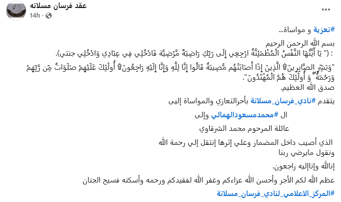 في المقابل، قادنا البحث بالكلمات المفتاحية إلى تعزية نشرها المركز الإعلامي لنادي فرسان مسلاتة بتاريخ 2 نوفمبر 2025، التي أكدت وفاة المرحوم محمد الشرقاوي الذي أصيب داخل المضمار وعلى إثرها انتقل إلى رحمة الله: