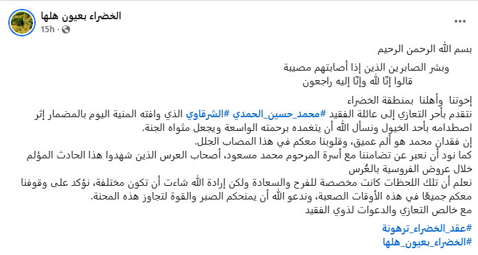 كما توصلنا لتعزية آخرى لصفحة "إخوتنا وأهلنا بمنطقة الخضراء" لعائلة الفقيد محمد حسين الحمدي الشرقاوي الذي وافته المنية بالمضمار في ترهونة إثر اصطدامه بأحد الخيول خلال عروض الفروسية في احتفال زفاف  مما يؤكد صحة خبر الوفاة وحادثة العرس، لكن يؤكد أن الفيديو المستخدم لتصوير اللحظة هو فيديو قديم وغير مرتبط بهذه الواقعة.