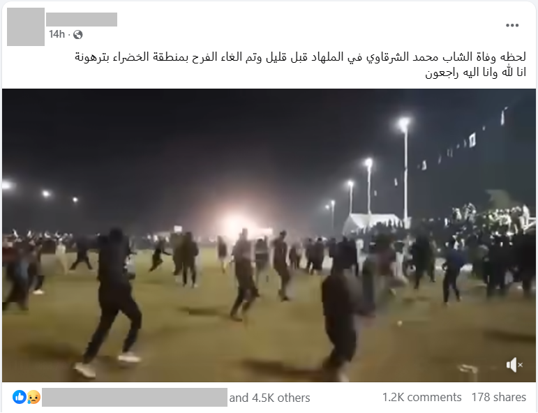 قمنا برصد ادعاء لأول مرة من إحدى الحسابات على منصة فيسبوك، والذي نُشر يوم 2 نوفمبر 2025 الساعة 22:19 مساءاُ، وكان نص الادعاء كالاتي: "لحظه وفاة الشاب محمد الشرقاوي في الملهاد قبل قليل وتم الغاء الفرح بمنطقة #الخضراء #ترهونة أنا لله وانا اليه راجعون"