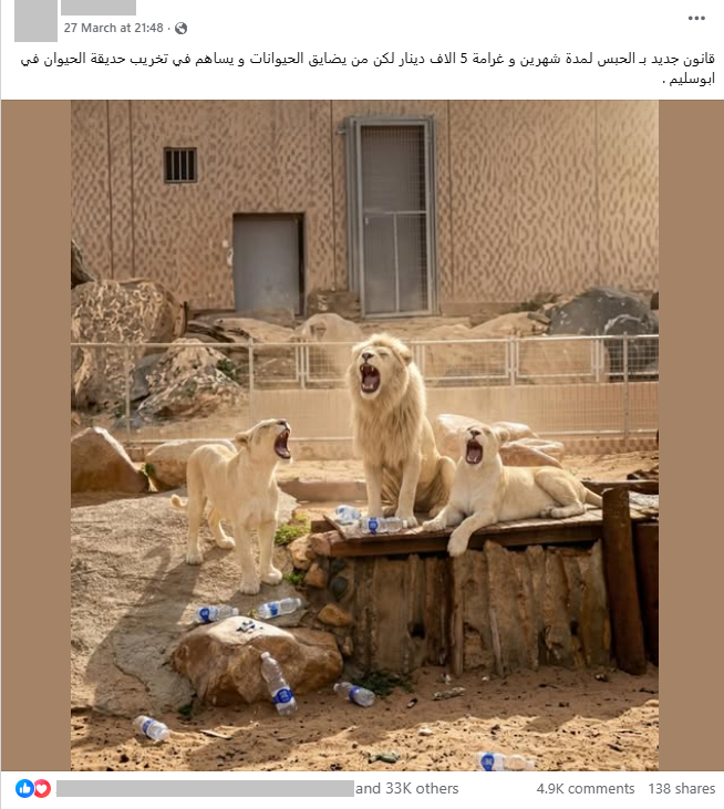 "قانون جديد بـ الحبس لمدة شهرين و غرامة 5 الاف دينار لكن من يضايق الحيوانات و يساهم في تخريب حديقة الحيوان في ابوسليم."