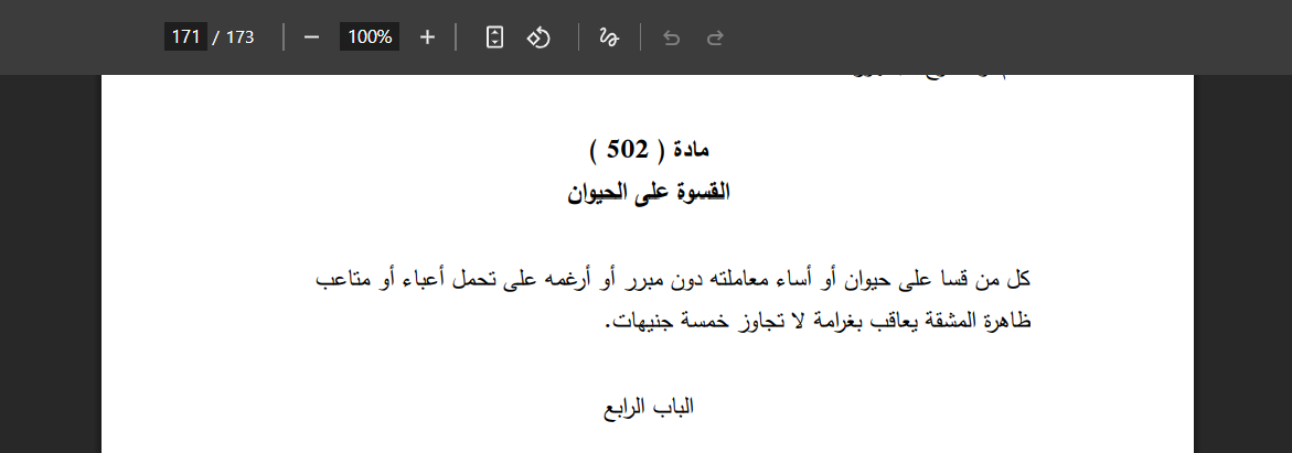 وبالاطلاع على قانون العقوبات الليبي المنشور على الموقع الرسمي للضمان الاجتماعي، تبيّن أن المادة 512 المتعلقة بالقسوة على الحيوان تنص على أن كل من قسا على حيوان أو أساء معاملته دون مبرر يعاقب بغرامة لا تتجاوز خمسة دانانير، وهو ما يختلف تمامًا عن العقوبات المتداولة في الادعاء.