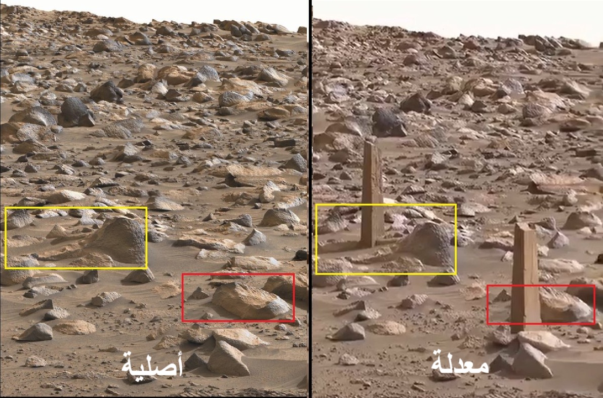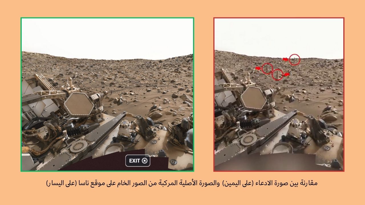 بمقارنة المشاهد في الفيديو مع الصورة الأصلية، نلاحظ أن الأجسام “العمودية” الظاهرة في المقطع ليست موجودة في الصور الأصلية، ما يؤكد أنها مضافة رقمياً.