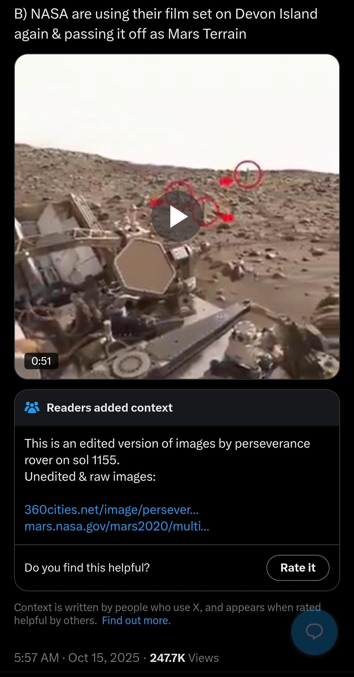 أوضحت الملاحظة أن الفيديو معدل من صور التقطتها مركبة Perseverance التابعة لناسا خلال يومها الـ 1155 على سطح المريخ، مع رابط للصور الخام المنشورة على الموقع الرسمي لناسا: