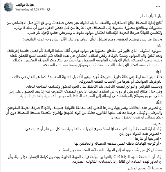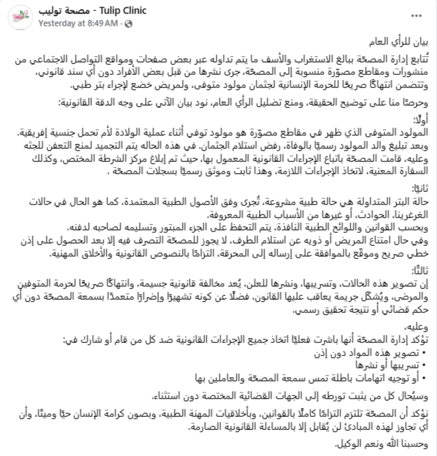 وبالتوازي مع ذلك، نشرت الصفحة الرسمية لمصحة توليب بياناً عن الواقعة أفادت فيه بأن "اإدارة المصحة تتابع ما يتم تداوله عبر صفحات ومواقع التواصل الاجتماعي من منشورات ومقاطع دزن أي سند قانوني" على تمام الساعة 8:49 صباحاً: