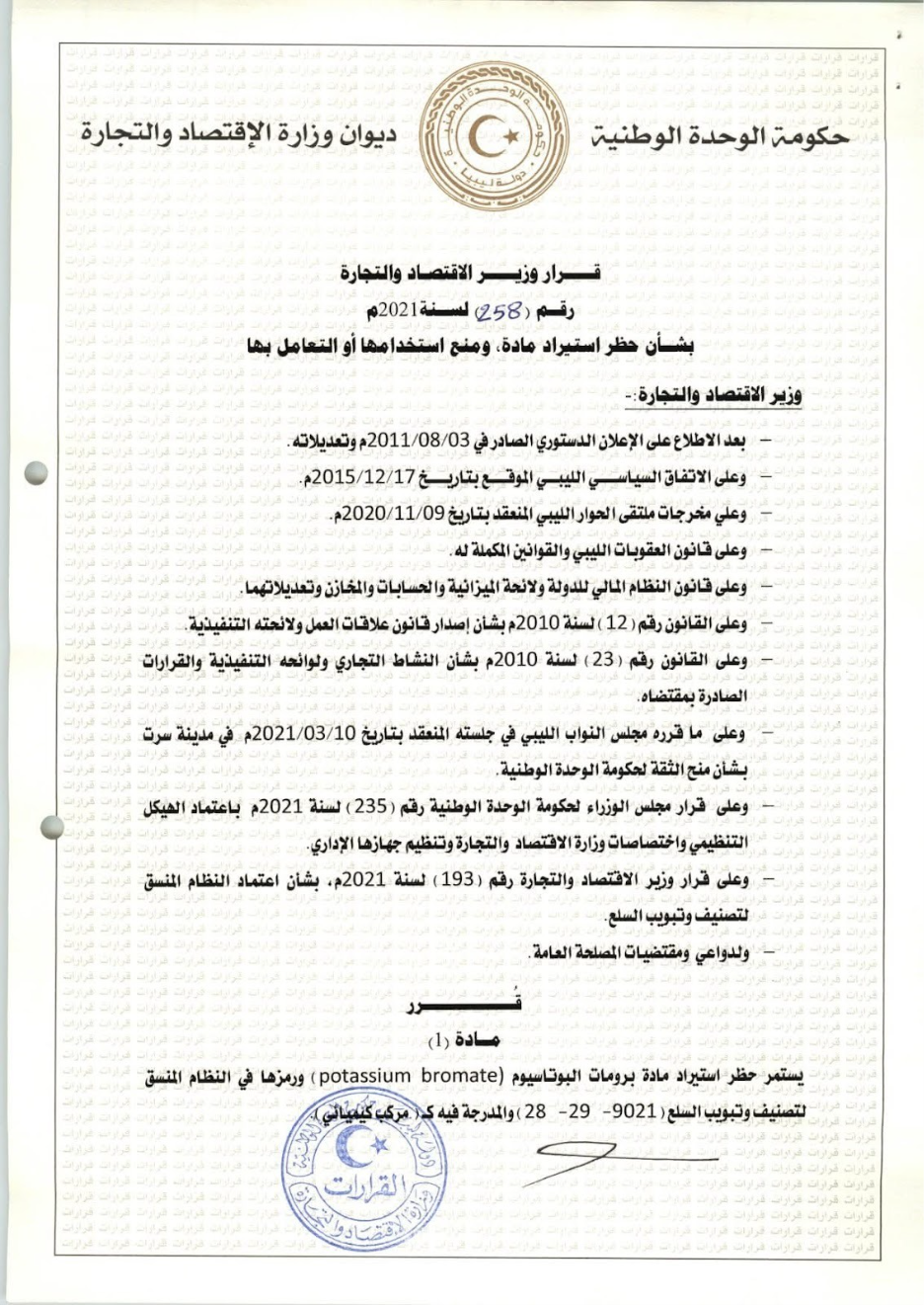 صورة لقرار حظر استخدام مادة برومات البوتاسيوم