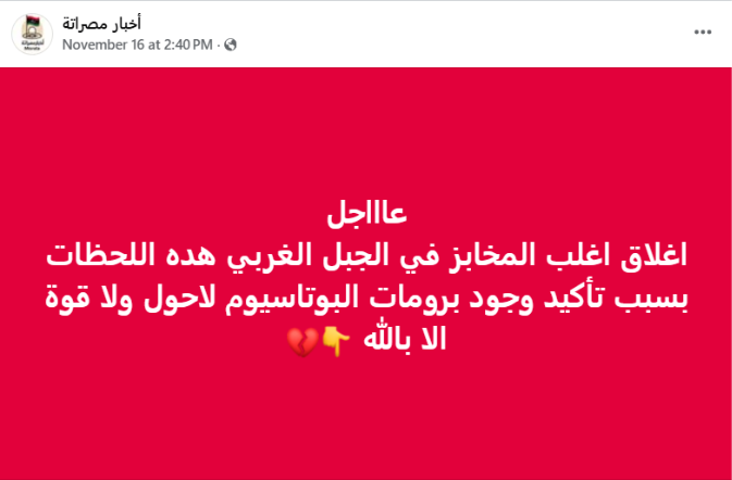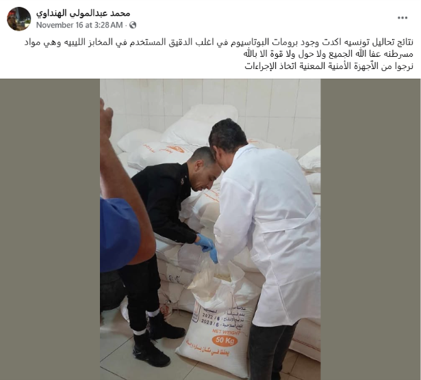 "اغلاق اغلب المخابز في الجبل الغربي هده اللحظات بسبب تأكيد وجود برومات البوتاسيوم لاحول ولا قوة الا بالله"
