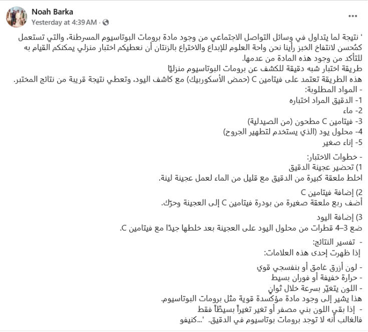 "نتيجة لما يتداول في وسائل التواصل الاجتماعي من وجود مادة برومات البوتاسيوم المسرطنة، والتي تستعمل كمُحسن لانتفاخ الخبز رأينا نحن واحة العلوم للإبداع والاختراع بالزنتان أن نعطيكم اختبار منزلي يمكنكم القيام به للتأكد من وجود هذه المادة من عدمها طريقة اختبار شبه دقيقة للكشف عن برومات البوتاسيوم منزليًا. هذه الطريقة تعتمد على فيتامين C (حمض الأسكوربيك) مع كاشف اليود، وتعطي نتيجة قريبة من نتائج المختبر... مع تفاصيل المواد المطلوبة وخطوات الاختبار وتفسير النتائج: ظهور اللون الأزرق الغامق أو البنفسجي يشير إلى وجود المادة المؤكسدة"