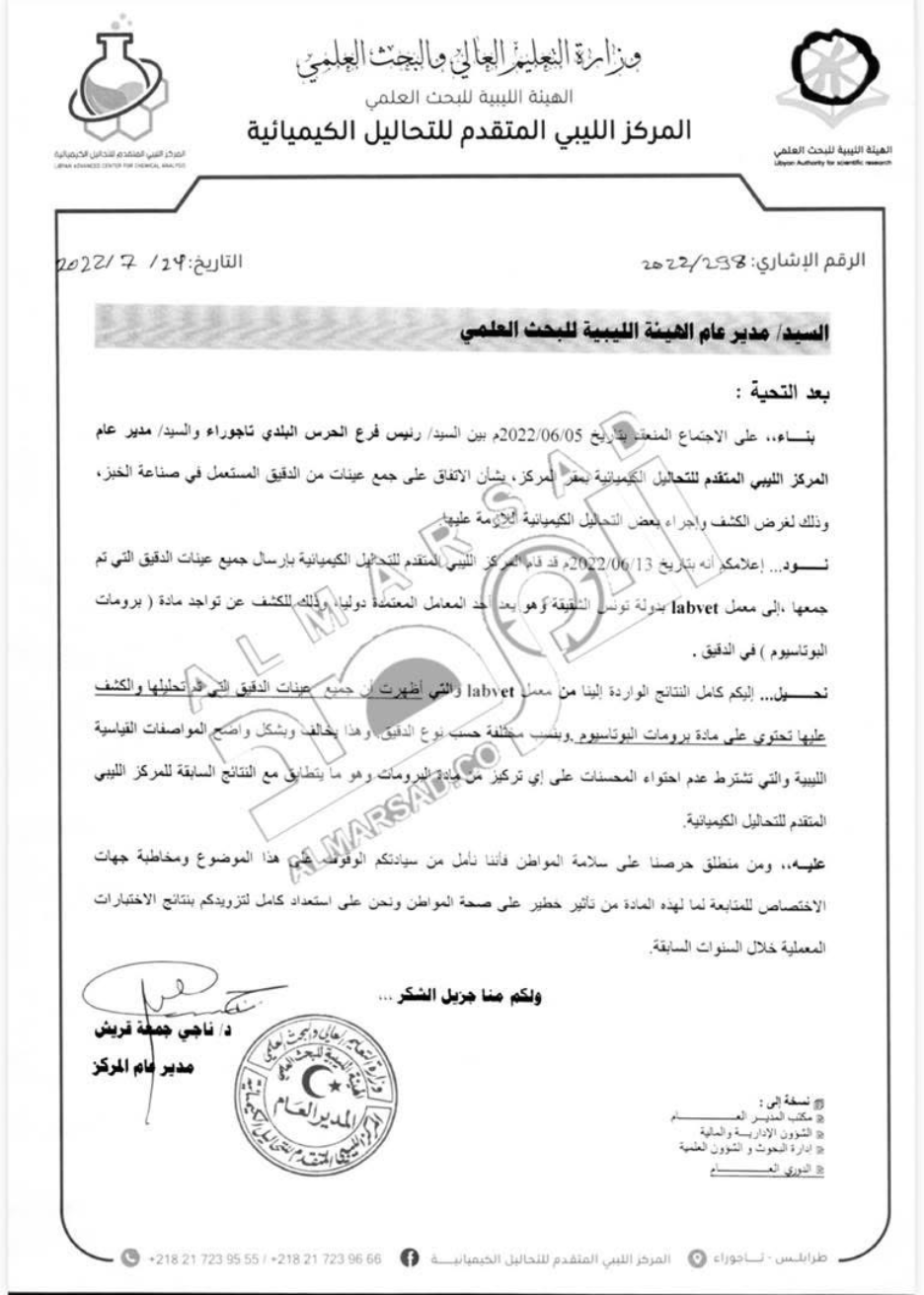 صورة تظهر تقرير مختبري لعينات من الدقيق الليبي لبرومات البوتاسيوم